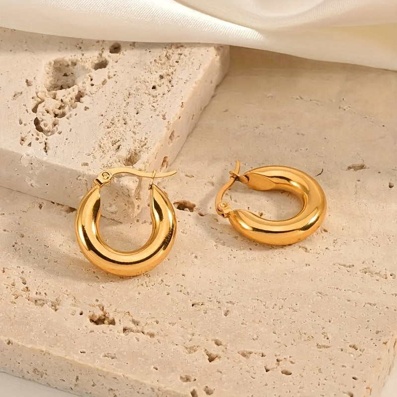 Fashionable Stainless Steel Round Thick Loop Earrings, Plated With 18K Golden Glossy Round Earrings, Perfect For Anniversary Birthday Gifts