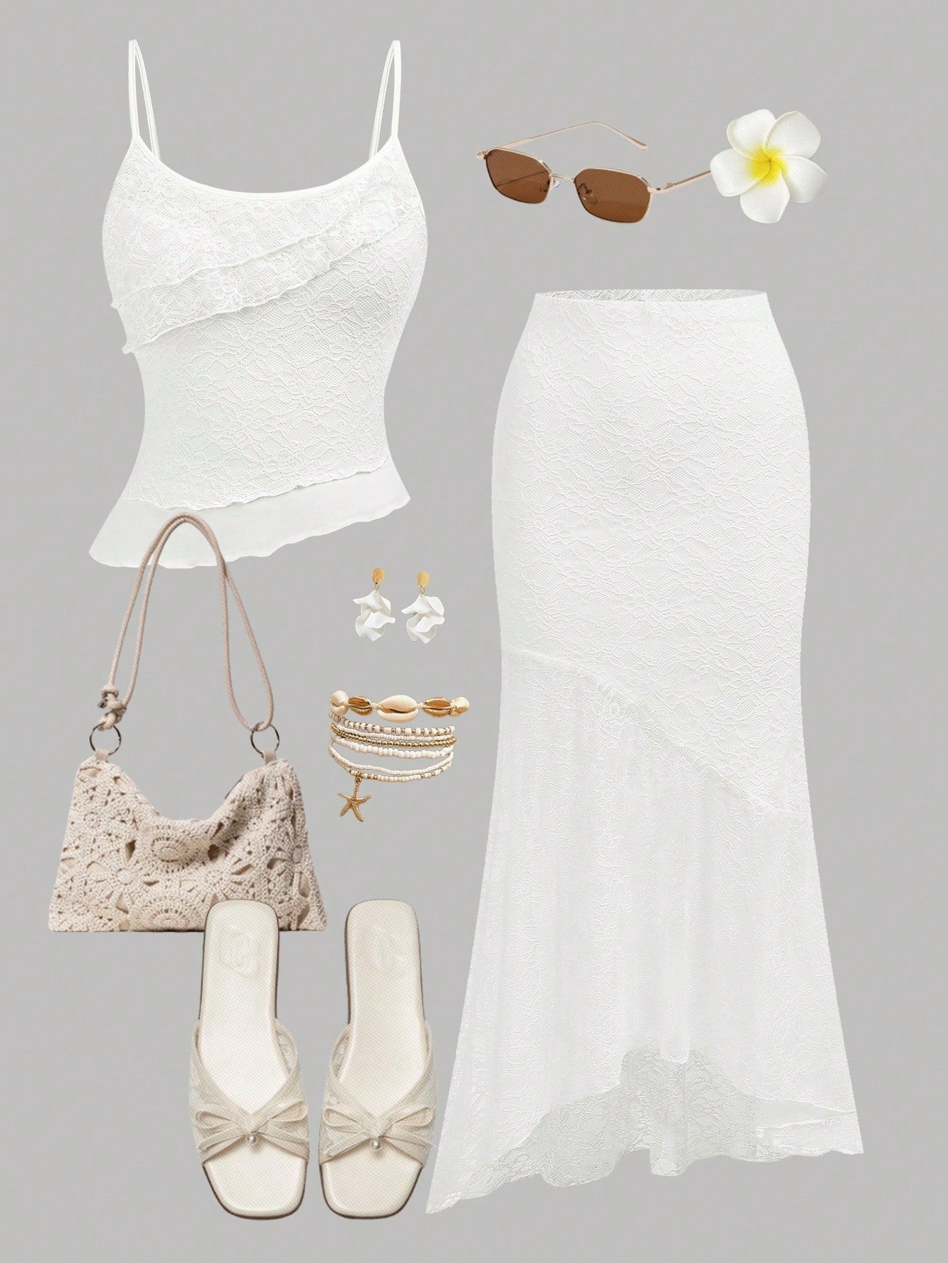 Girlism 2pcs/Set TEENGIRL Resort & Wedding Lace Asymmetric Hem Top And Low Waist Fishtail Ruffle Asymmetrical Hem Skirt, Elegant Wedding Outfit